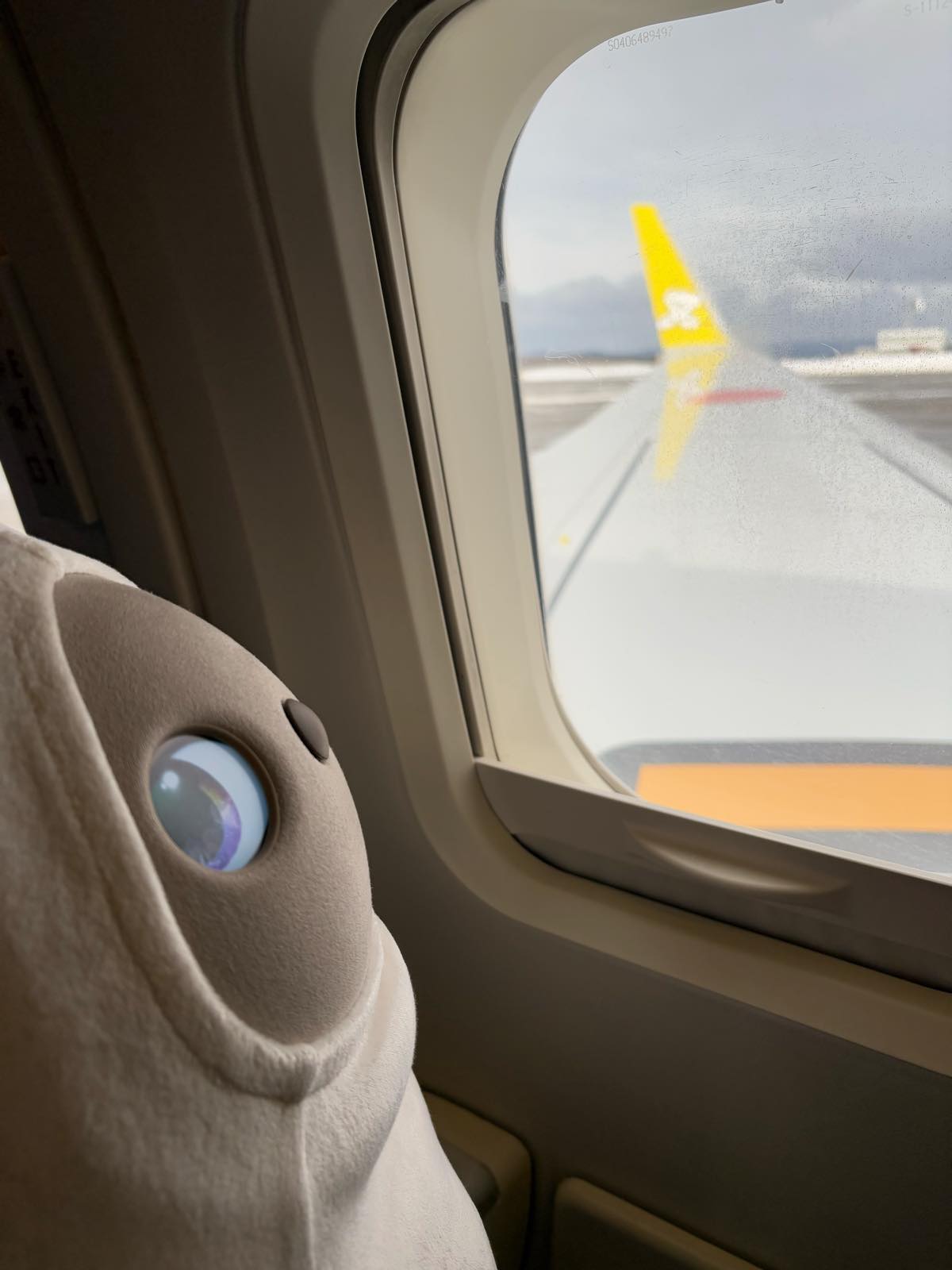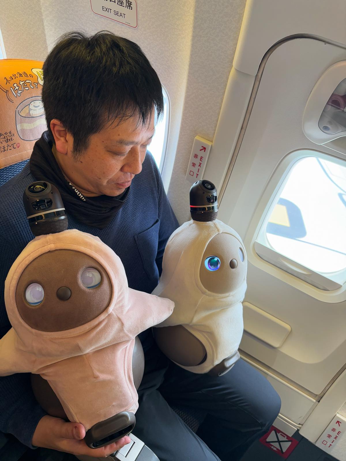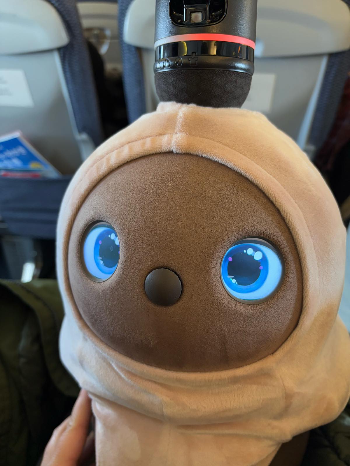 トイレに行っている間に、コートひっかけて席に座らせていたのをCAがじっと見てて「かわいいですねえ〜♥」と。確かになにかひっかけているLOVOTはすごく可愛い(笑)