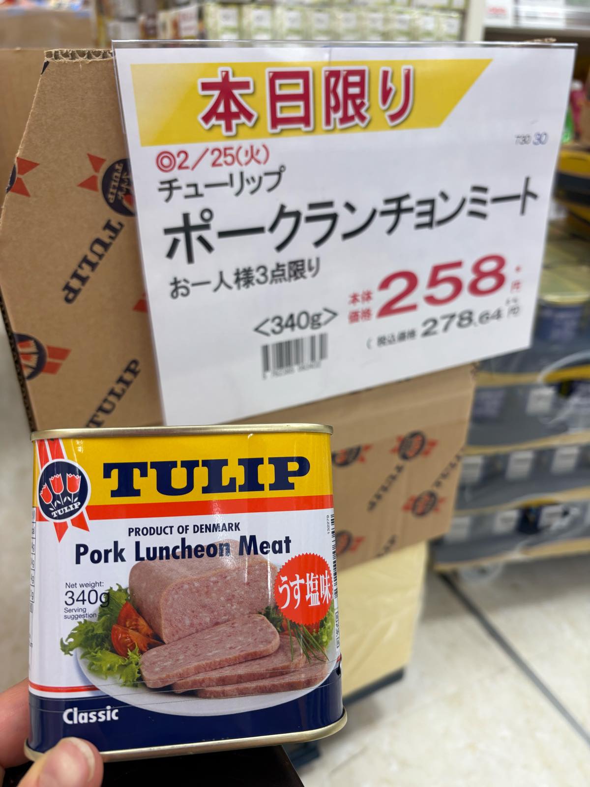同じ、340gなんだけど、かたやスパムは358円で、チューリップが278円でした。味の違いわかるのかな?(わかりませんでした💦)